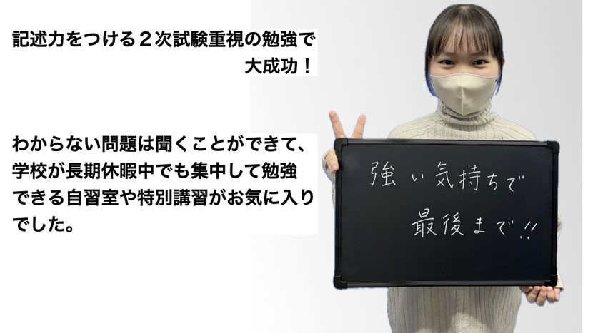 ーー入塾時から学校や塾の勉強に真剣に取り組んでいましたし、高校3年では理系選抜クラスに入りました。そして、共通テストより国立大学2次記述試験を想定した勉強に取り組みましたね。